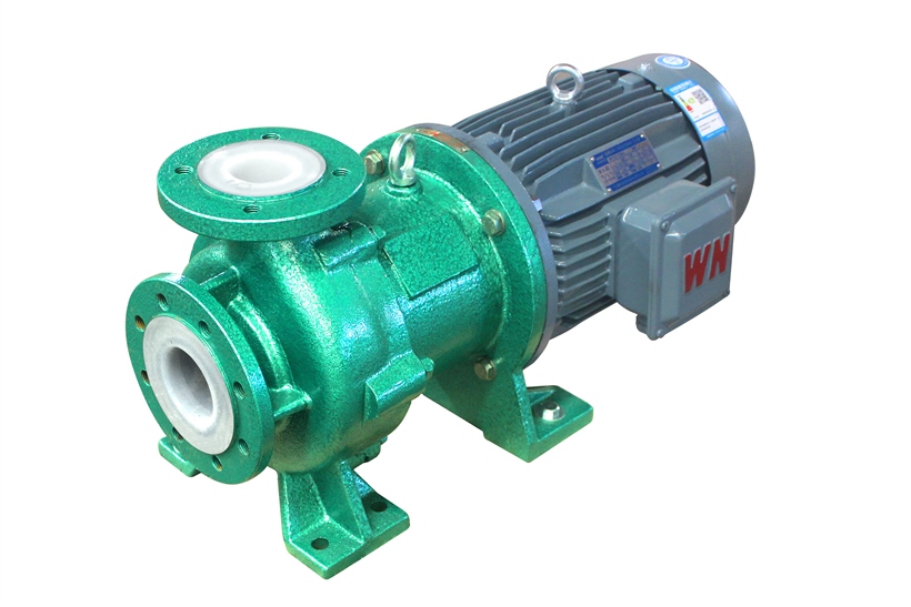 泵運(yùn)轉(zhuǎn)時(shí),氟塑料磁力泵必須用少量的液體對(duì)內(nèi)磁轉(zhuǎn)子與隔離套之間的環(huán)隙區(qū)域和滑動(dòng)軸承的摩擦副進(jìn)行沖洗冷卻。當(dāng)冷卻潤(rùn)滑液不夠或沖洗孔不暢、堵塞時(shí),將導(dǎo)致介質(zhì)溫度高于永磁體的工作溫度,使內(nèi)磁轉(zhuǎn)子逐步失去磁性,使磁力傳動(dòng)器失效。冷卻液的流量通常為泵設(shè)計(jì)流量的2%-3%,內(nèi)磁轉(zhuǎn)子與隔離套之間的環(huán)隙區(qū)域由于渦流而產(chǎn)生高熱量。當(dāng)介質(zhì)為水或水基液時(shí),可使環(huán)隙區(qū)域的溫升維持在3-5℃;當(dāng)介質(zhì)為烴或油時(shí),可使環(huán)隙區(qū)域的溫升維持在5-8℃。